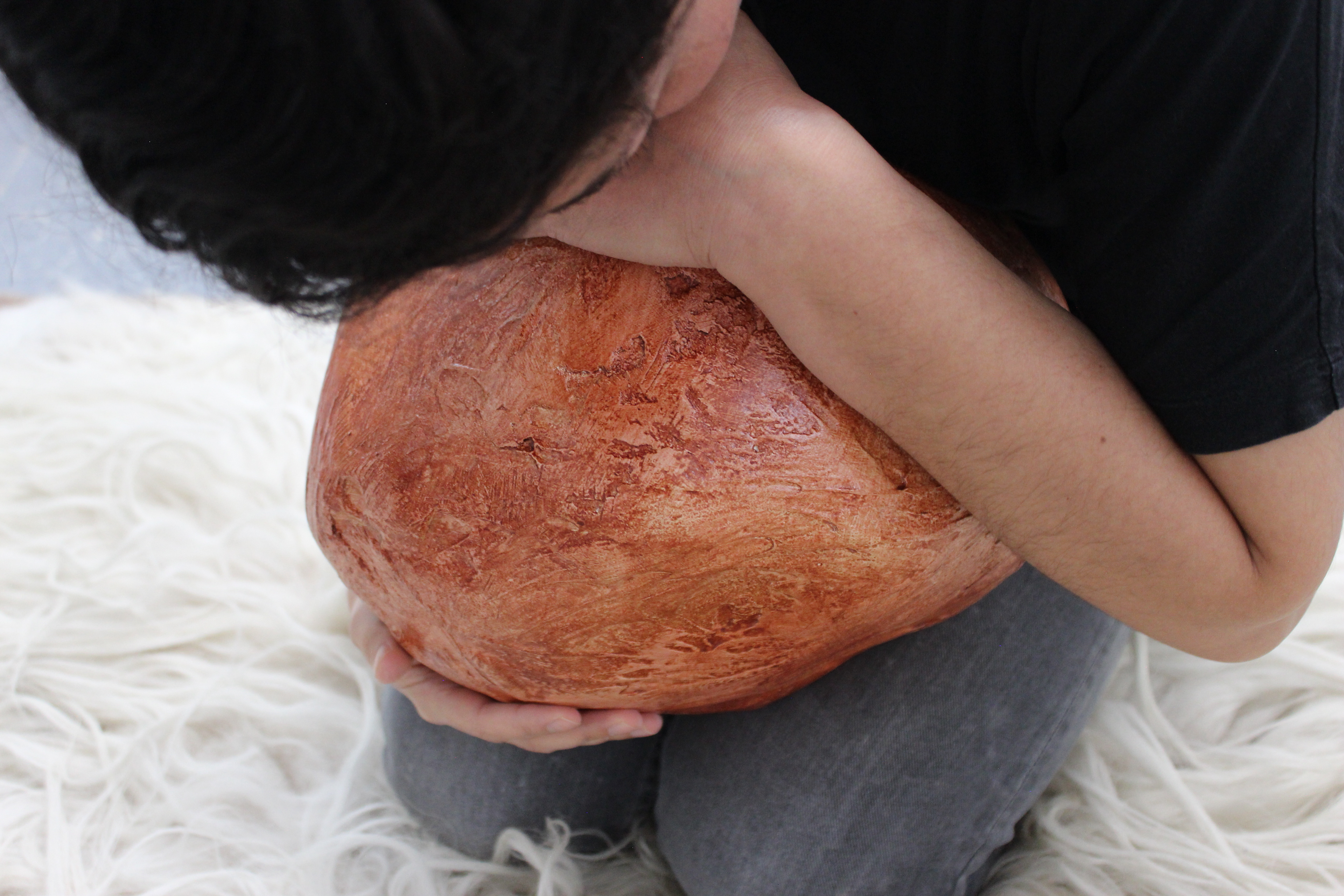 In maart 2020 vertrok ze naar een residency in Zuid Spanje, een geïsoleerde plek waar het internet nauwelijks bereik had en enkel vrouwen bijeen waren. De grond was er droog en woestijnachtig. Rondom groeiden Aleppo pines, die altijd groene coniferen met hun zachte, geelgroene naalden, die daar eeuwen terug zijn geplant. Te midden van niets anders dan het ruisen van de naalden en de trilling in de lucht klonk de stilte er vol. Zo had ze nog niet eerder naar de stilte geluisterd. De energie zinderde en tilde haar op alsof ze gedragen werd. Handelingen komen er tot leven: twee krachtige, fiere vrouwen staan rechtop tegenover elkaar terwijl ze ieder een halve bol van klei, verbonden door een touw, tegen hun navel houden. Ze kijken elkaar in de ogen maar de energie cirkelt ook rond via de verbonden halve bollen. De maagstreek is immers het gebied waar de emoties samenkomen en verteren. (6) Op de achtergrond tekenen de bergen zich af als borsten. (7) ‘Wij zijn zelf ook replica’s van moeder aarde’, zegt Ossef tegen me. ‘Wij zijn één met de aarde, dat is mijn ware identiteit en mijn wens is om dat letterlijk weer terug te halen. Al het andere is een label, iedere aanduiding laat de werkelijkheid krimpen als een dwangbuis.’